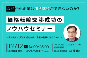 価格転嫁交渉成功のノウハウセミナー 昨今の円安や物価高の影響で、多くの中小企業がコスト上昇の影響を受けています。しかし、価格転嫁の実現には大きな壁があり、最新の調査では転嫁率が46%にとどまっています。これが中小企業の賃 … 続きを読む 価格転嫁交渉成功のノウハウセミナー