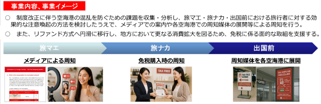対前年度比6.25倍の増額です。制度改正に伴う空海港の混乱を防ぐため、課題を収集・分析し、旅行者に対する効果的な注意喚起の方法を検討・周知します。また、免税に係る面的な取組を支援します。