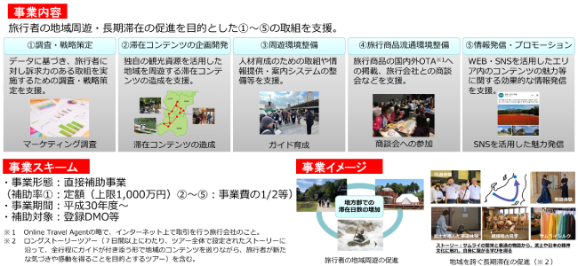 直接補助事業として、地域独自の観光資源を活用した滞在コンテンツ(訪日外国人が日本滞在中に体験・消費する観光や文化、サービス)の企画開発や、周遊環境整備(情報提供や案内システムの整備)などを支援します(補助率1/2等)。