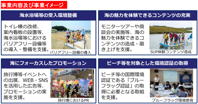 ALPS処理水の海洋放出による風評への対策として、岩手県、宮城県、福島県及び茨城県の市町村、観光協会および登録DMOを補助対象に、海の魅力を高めるブルーツーリズムを推進するため、海水浴場等におけるバリアフリー設備の導入・整備や、体験コンテンツの造成・磨き上げ、プロモーションの実施などを支援します(直接補助事業、補助率8/10等)。