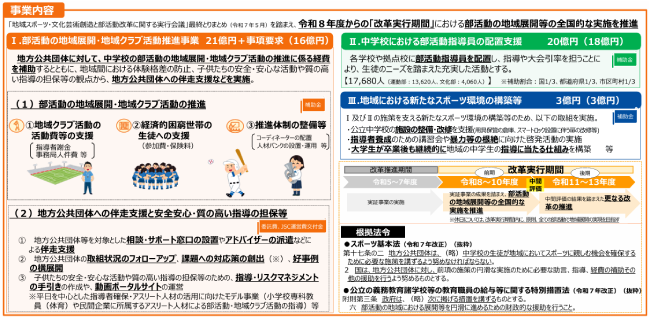 - 部活動の地域展開・地域クラブ活動推進事業(21億円+事項要求):地方公共団体に対して、中学校の部活動の地域展開や地域クラブ活動の推進に要する経費を補助するとともに、地域間における体験格差をなくし、子供たちの安全・安心な活動や質の高い指導を実現するため、地方公共団体への伴走支援を実施します。
