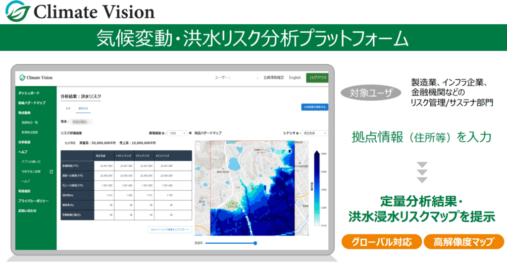 東京大学発のグローバル・高解像度洪水シミュレーション技術(Climate Vision/Water Vision)を活用し、気候・水リスク分析ソリューションを提供しています 。