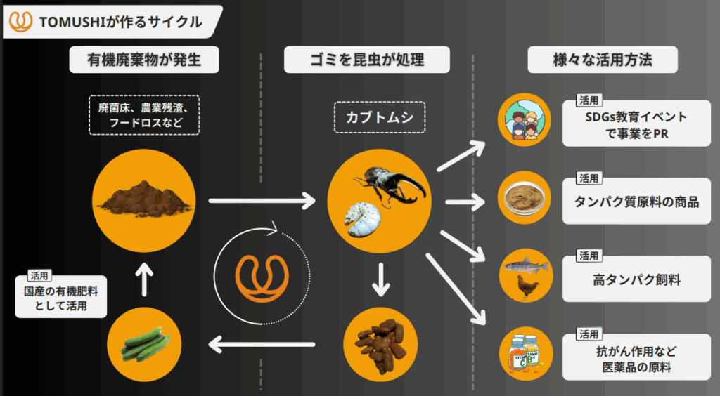 カブトムシの幼虫を活用し、地域の廃菌床や農業残渣などの有機廃棄物を処理する事業を展開。処理後のフンは国産の有機肥料として活用され、幼虫は高タンパク飼料や医薬品の原料などに変換される、循環型のビジネスモデルです。