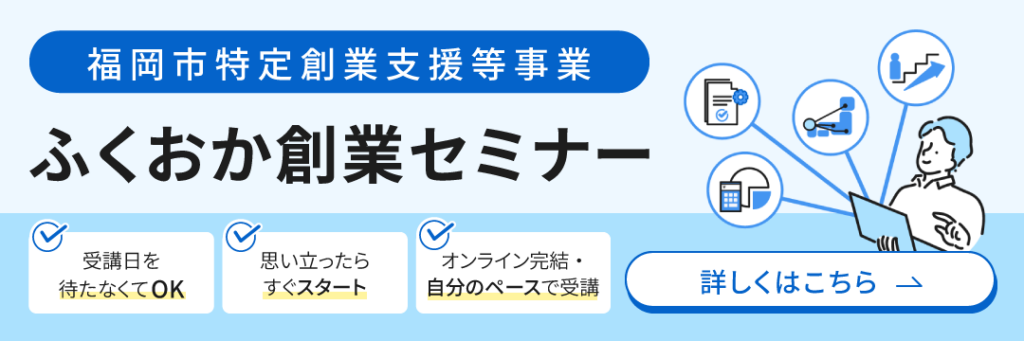 一般社団法人 九州広域行政事務支援機構では、そんな忙しい創業者の皆様のために、福岡市と連携した創業支援プログラム「ふくおか創業セミナー」をオンラインで提供します。