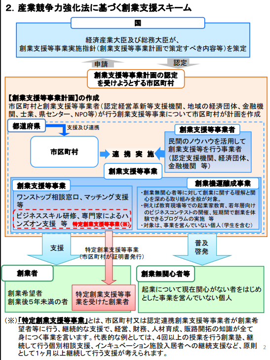 - 国(経済産業省):「日本中に起業家を増やそう」という法律(産業競争力強化法)を担当しています。