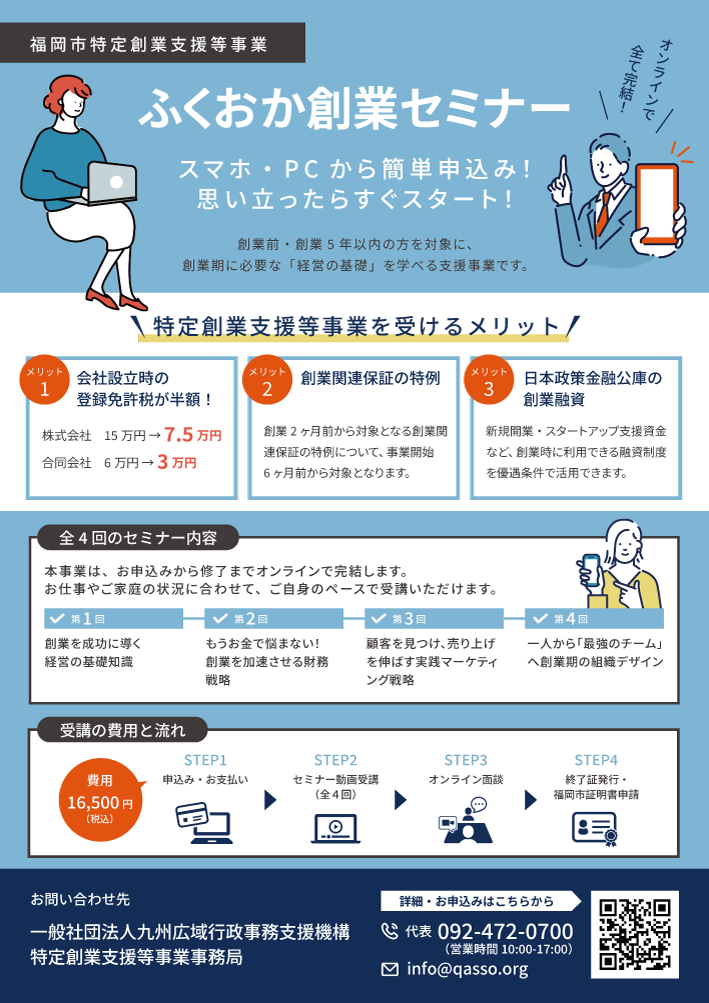 一般社団法人 九州広域行政事務支援機構の「ふくおか創業セミナー」なら、申し込みから受講までオンラインで完結します。メールでのお問い合わせはinfo@qasso.orgまで。