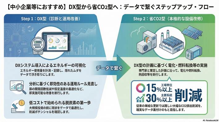 今年度はDX型で運用改善を行い、そのデータと削減計画を持って翌年以降に省CO2型の大規模改修へ進むという、中長期的な計画を描くのが理想的です。