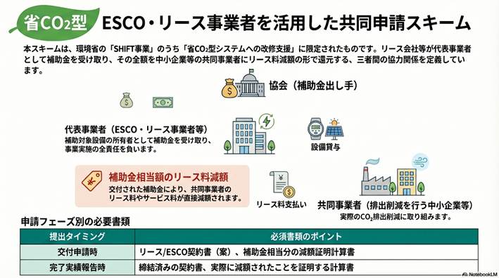 - 省CO2型の場合:リース会社やESCO事業者(設備の所有者)が「代表事業者」として補助金を直接受け取り、設備を導入する中小企業は「共同事業者」として共同申請します(※5.1で触れた通り、中小企業は現金の代わりにリース料やサービス料の値引きという形で実質的なメリットを受けます)。