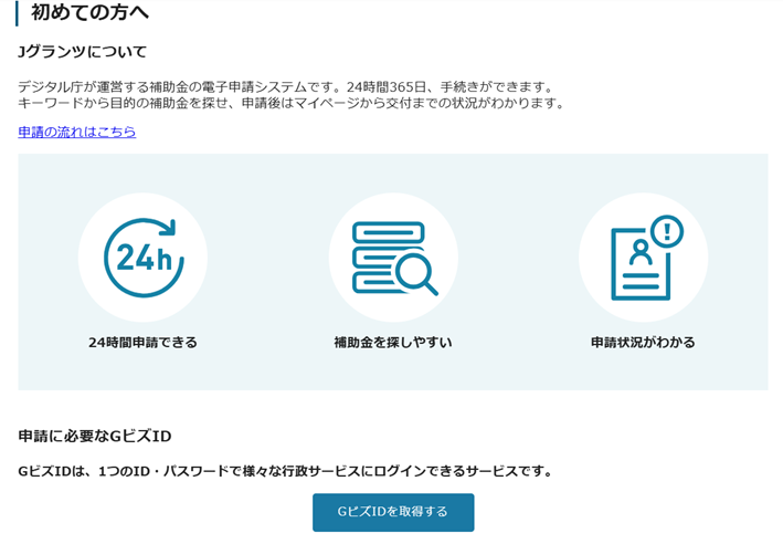 DX型、省CO2型ともに、原則として、電子申請システム「Jグランツ」を利用します。Jグランツを利用するにはGビズIDの取得が必要です。