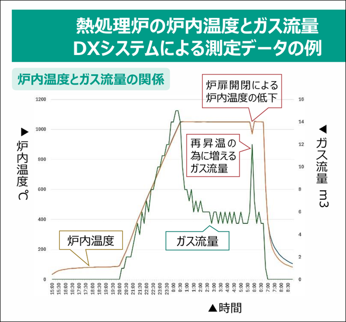 - 取り組み内容:DXシステムや各種センサー(サーモカメラ等)を導入し、これまで見えなかった工業炉の扉の開閉による温度低下やコンプレッサーのエア漏れをデータで可視化。特定したデータをもとに運用ルールを見直し、エア漏れの修繕といった小規模な改善と組み合わせて無駄を徹底的に排除しました。