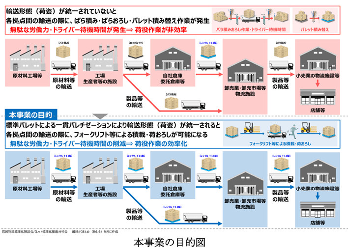 【重要:実施概要図】審査では、実施概要図(物流フロー図)の完成度が非常に重視されます。「どこでバラ積みが解消されるのか」「一貫パレチゼーションの範囲」「パレット使用枚数・便数の変化」を定量的に示すことが採択の鍵となります。