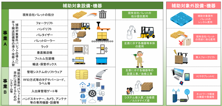パレットを扱うために必要な機械やシステムの導入費用として、大きくAとBの2つのカテゴリーが補助対象となります。単なるハードとソフトの違いではなく、「何のための効率化か(目的)」で選ぶのがポイントです。