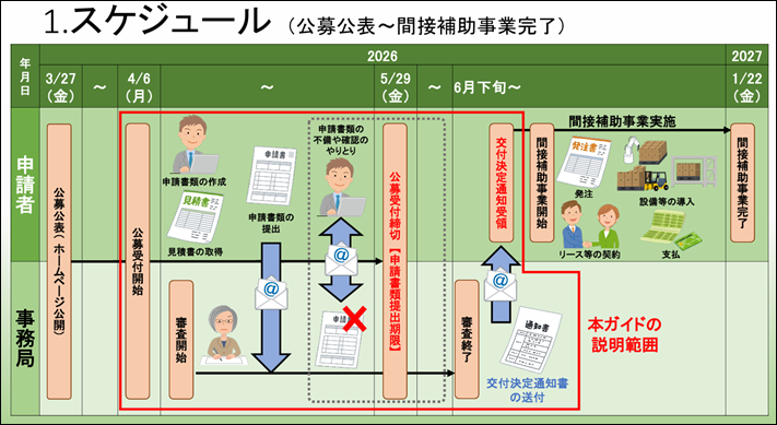 • 事業完了日令和9年1月22日(金)。この日までに設備等の導入から代金の支払い、効果測定までを終わらせる必要があります。余裕を持ったスケジュールを組んでください。