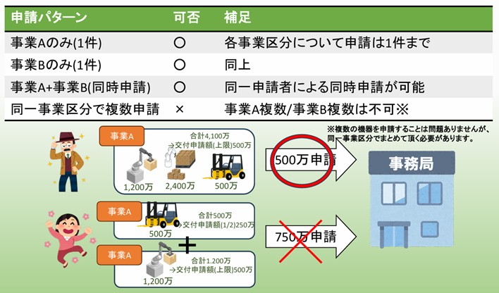 同一事業者が事業Aと事業Bを同時に申請することも可能です。ただし、「事業Aを2回に分けて申請する(例:拠点ごとに別々で出す)」といった同じ事業枠での複数申請は認められません。複数の機械や拠点で導入する場合は、必ず1回の申請にまとめてください。
