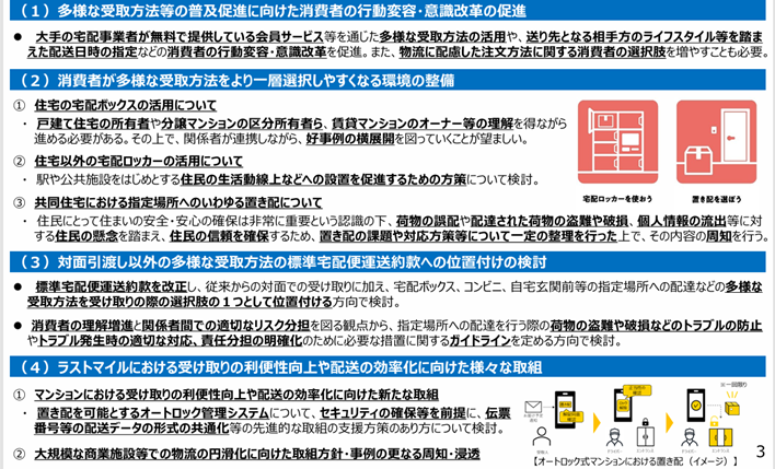 一つ目の柱は、再配達を減らし、より確実に荷物を受け取れる環境づくりです。これまでの「対面・最短・個社完結」を当然とするサービスから、受け取り側と協力して一回で確実にバトンを渡す「インフラ共有・ゆとり・多様な受取」を前提としたモデルへの根本的な転換を求めるものです。「サービスモデルの変革」と言えるでしょう。