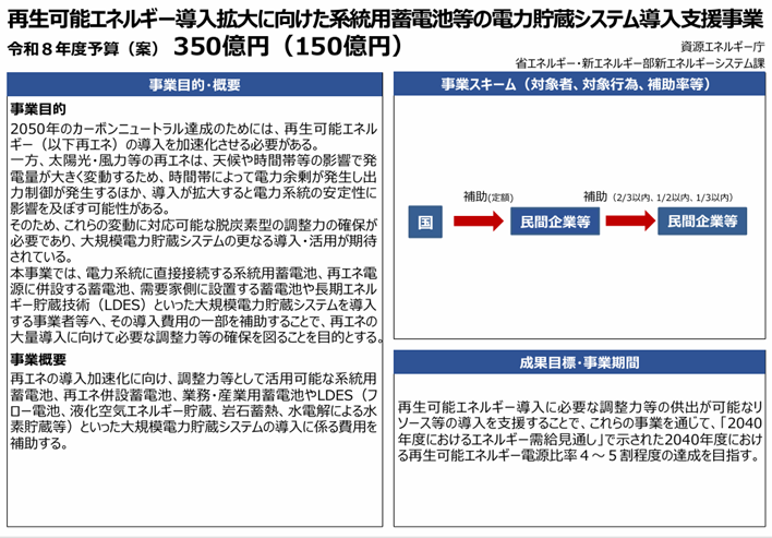 - >再生可能エネルギー導入拡大に向けた系統用蓄電池等の電力貯蔵システム導入支援事業(350億円):再エネを無駄なく使う蓄電システム導入を支えます。