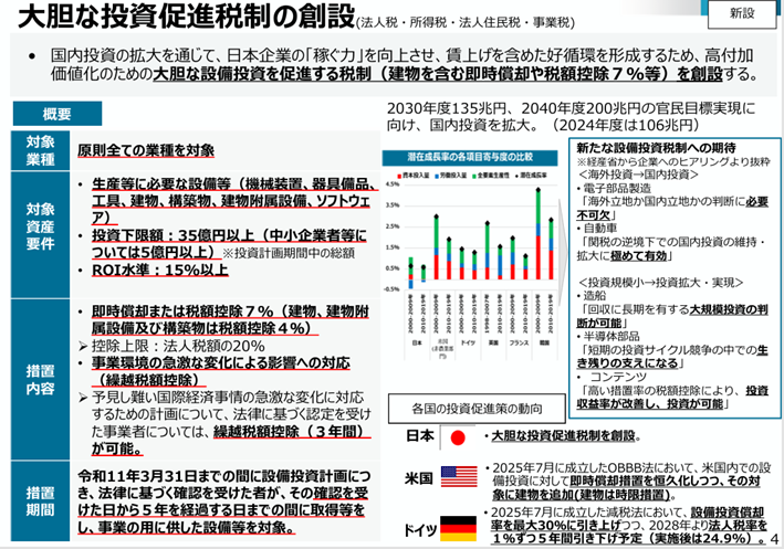 高付加価値な投資を行う企業を対象に、建物まで含めた「即時償却(100%経費化)」または税額控除7%(建物、建物附属設備及び構築物は税額控除4%)を認める極めて異例で強力な税制が要望されています(※投資下限額やROI(投資利益率)水準に要件あり)。建物の即時償却に踏み切る背景には、国内に投資する企業を本気で後押しする強いメッセージが込められていると考えられます。