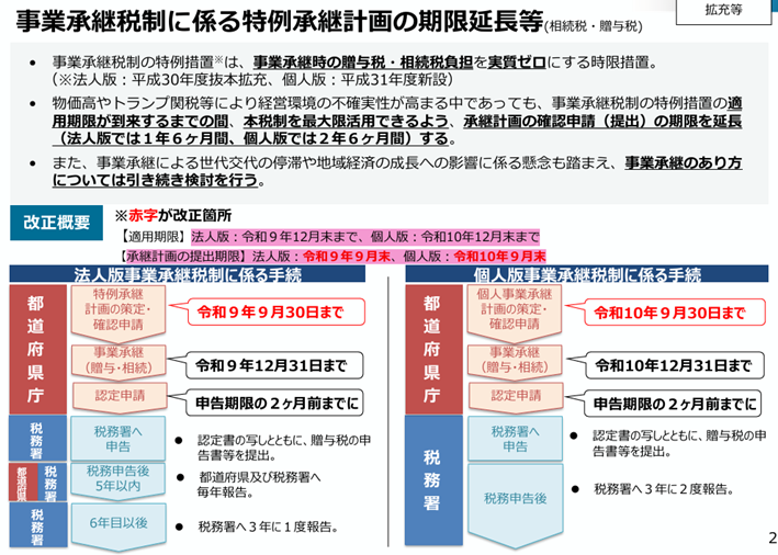 - 事業承継税制に係る特例承継計画の期限延長:事業承継時の贈与税・相続税を猶予する特例措置について、特例承継計画の提出期限が延長(法人版:令和9年9月末、個人版:令和10年9月末)されます。