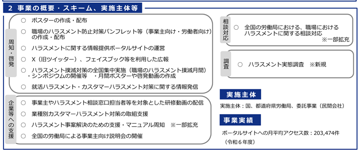 9.2億円。パワハラ、セクハラ、妊娠・出産、育児休業等に関するハラスメント、カスハラなどは労働者の尊厳を傷つけ、継続的な就業を妨げる大きな障害となります。相談窓口担当者等を対象とした研修動画の配信、マニュアル周知、労働局による相談対応、実態調査(新規)などが予定されています。