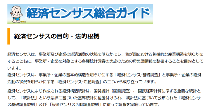 いわば、5年に一度実施される「経済の国勢調査」です。国内の事業所・企業の経済活動を全国的及び地域別に明らかにするとともに、事業所及び企業を対象とした各種統計調査の母集団情報を得るための調査です。