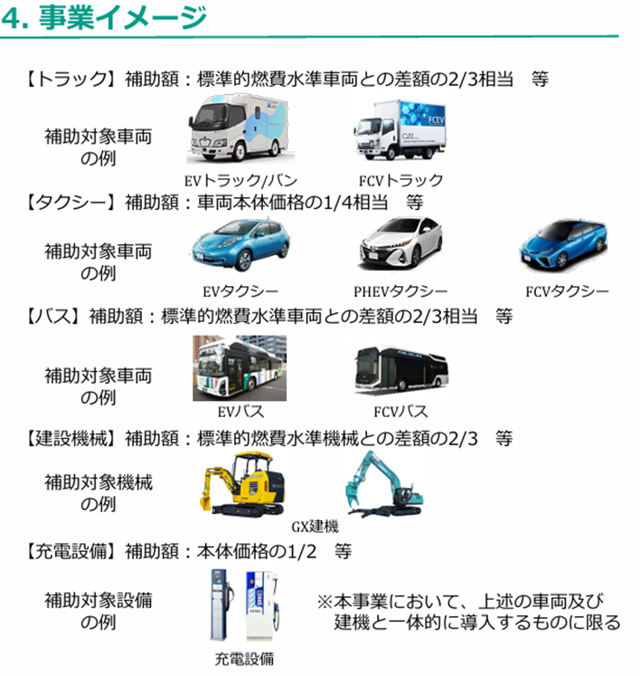 補正予算で300億円という極めて大きな予算が確保されています。通常、EVトラック等は高額ですが、この補助金を使えば、一部を除き、標準的なガソリン車との価格差の2/3が補助されるため、導入ハードルが大幅に下がります。
