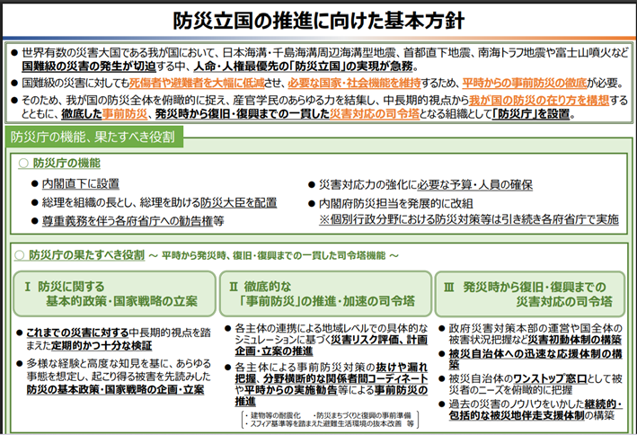 これまで各省庁にまたがっていた防災対応の司令塔が創設されます。注目は防災DXです。発災直後に衛星やドローン等の画像を統合して被害を把握するシステムの構築などが進められます。