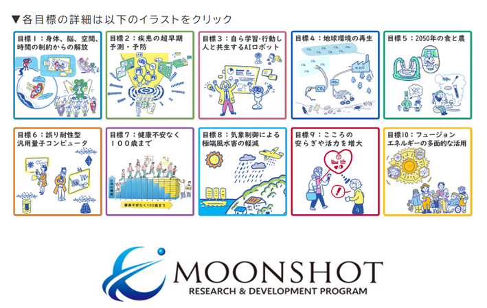 ムーンショット型研究開発制度で採択されているテーマ(例:負荷を感じずにQOL(生活の質)の劇的な改善を実現するロボット、循環型食料生産、AIとロボットの共進化)は、国が2050年までに実現したい未来です。