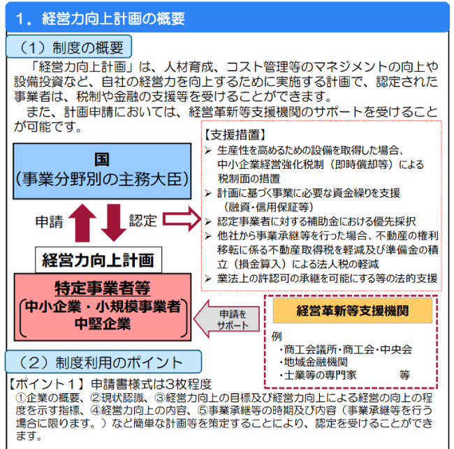 | 経営力向上計画 | 労働生産性の向上目標/事業分野別指針に沿った改善計画 | 事業の所管省庁 | 小規模事業者持続化補助金 | 成長基盤整備としての改善意志を制度化 |