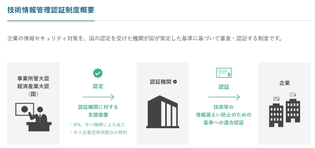 | 技術情報管理認証制度(TICS) | 情報管理体制の整備/サイバー、物理、人的対策 | 国の認定を受けた認証機関 | ものづくり補助金/中小企業新事業進出補助金 | 情報管理力を競争力の前提として制度化 |