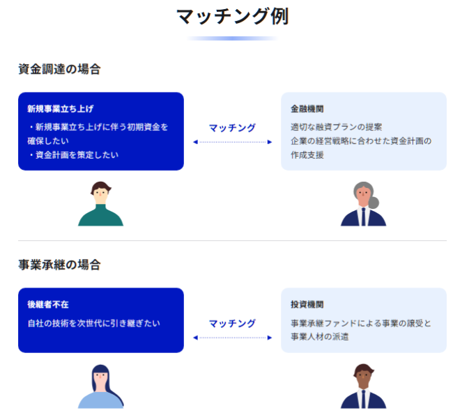 このサービスには、金融機関、投資機関、認定経営革新等支援機関など、多様な知識と経験を持つ支援者が登録しています。例えば、以下のようなマッチングが想定されています。
