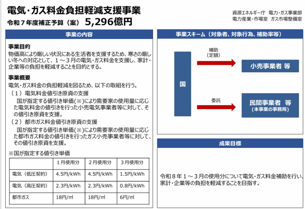 厳しい冬の間の負担を軽減するため、電気・都市ガス料金の値引き支援が行われます。