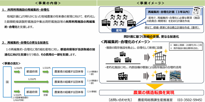 • 概要:老朽化した選果場、乾燥調製施設、卸売市場などを再編・集約する取り組みを支援します。