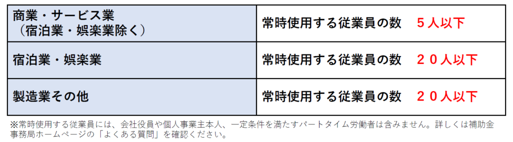 業種ごとに従業員数で小規模事業者であるか否かを判断しています。