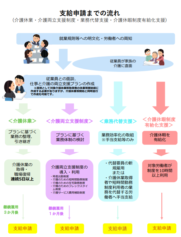 - 有給の介護休暇の導入:新たに有給の介護休暇制度を導入し、社員に利用させる。
