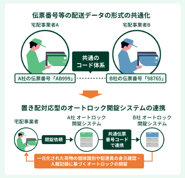 各社の伝票番号等を共通化し、オートロック開錠システムと連携して置き配の利便性とセキュリティを向上させる取組など。