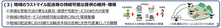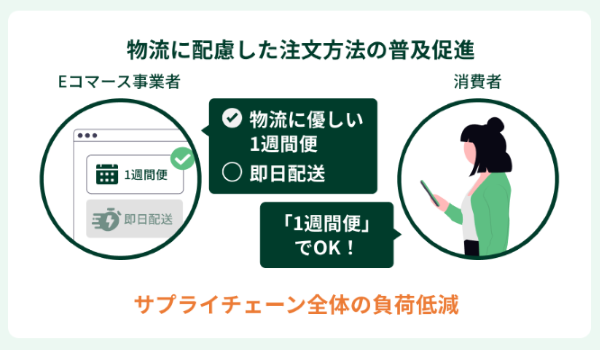 配送日数を長くとる注文方法を消費者に促し、行動変容を通じてサプライチェーン全体の負荷を軽減する取組など。